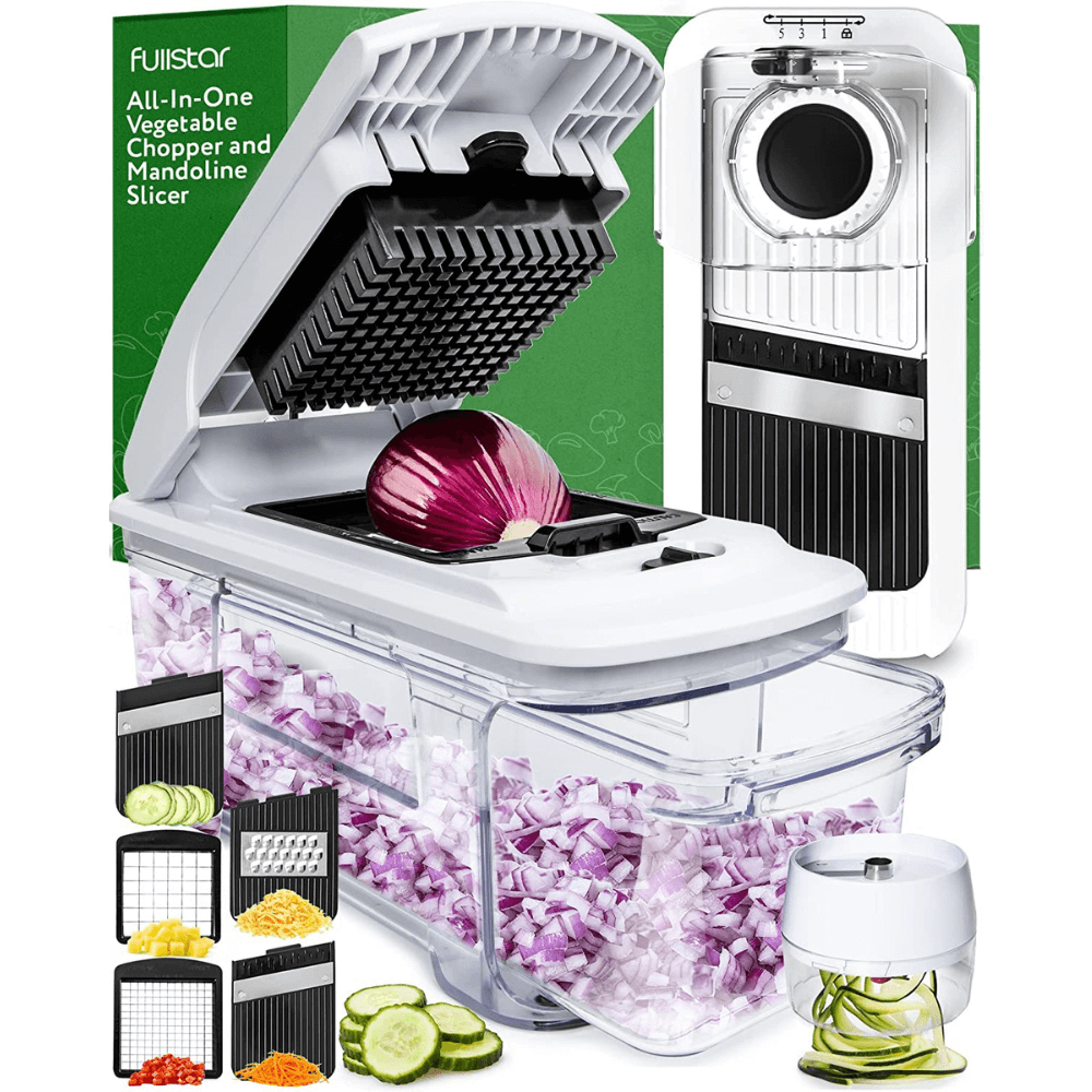 Chosen for its comprehensive functionality, the Fullstar Vegetable Chopper offers five interchangeable blades, a built-in chop lid, and a storage container. Its multifunctionality and ease of use make it a favorite for those seeking a versatile kitchen gadget.
